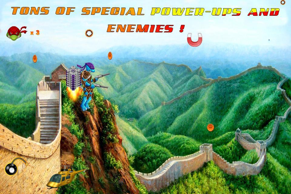非常簡單和有趣:用手指控制您的噴氣背包牛仔烏龜,讓他避免並射擊以摧毀忍者敵人。完成關卡時,解鎖不同的牛仔海龜!忍者幫派決定入侵世界上所有主要國家!